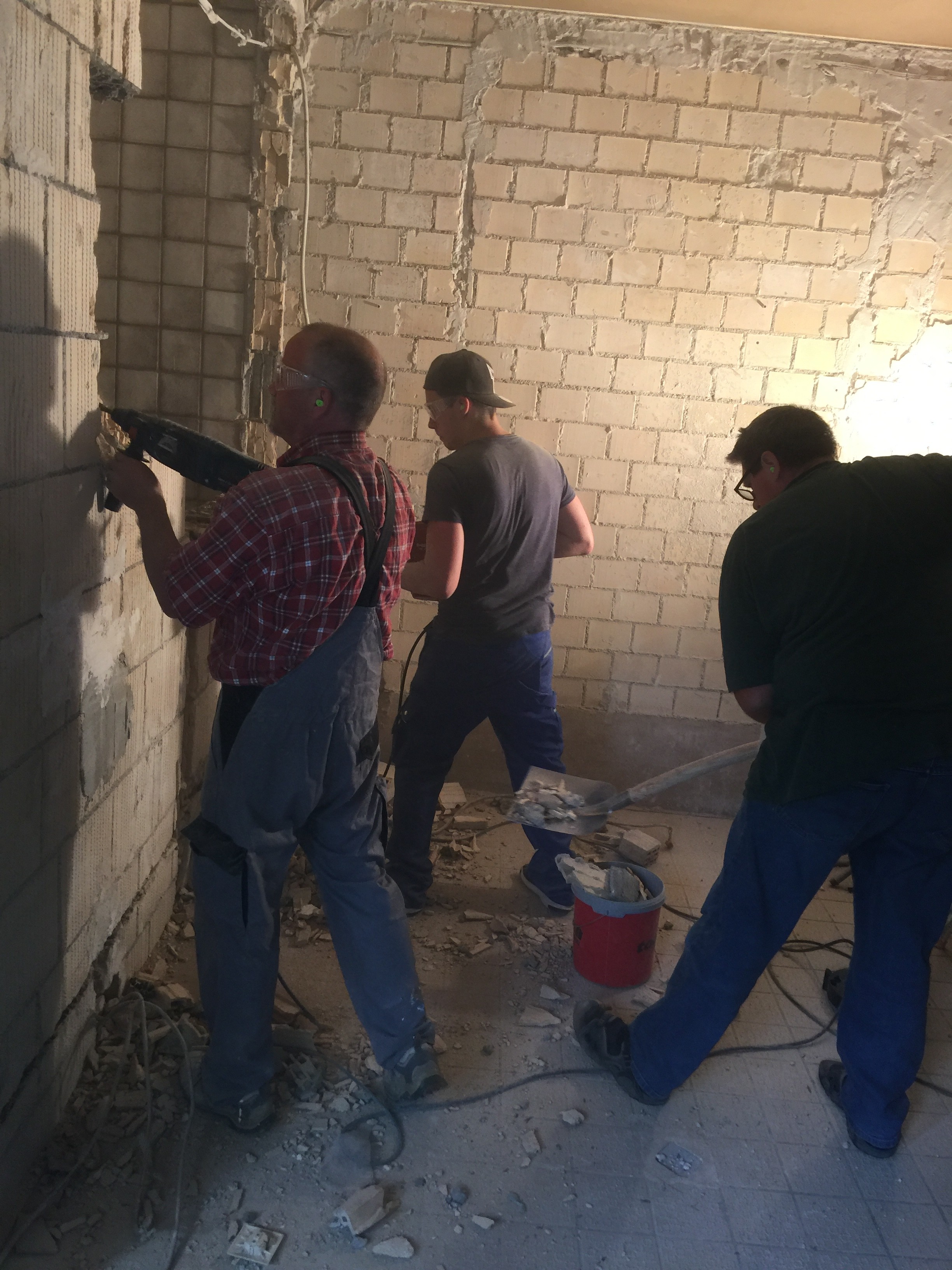 Am vergangenen Wochenende hämmerte die Bohrhämmer in unserem Gemeinderäumen in Wangen. Genau gesagt kam der Krach der Abrißarbeiten aus dem Küchentrakt. Die verwinkelten Wände hinter der ehemaligen Küche waren für unsere Zwecke nicht zu gebrauchen. Daher wurden sie herausgerissen. Fleißige Helfer haben mit angefasst und die schmutzige Arbeit erledigt. Jetzt kommen hinter der Küchentür nur noch nackte Wände und ein großer Raum. Als nächstes muss die ehemalige Kühlzelle entfernt werden. Da gibt es nochmal Krach und Dreck. Dann kann bald der Klempner und die Heizungsfirma kommen. Für den Einbau von einer sog. „Trockenbau-Wand“ brauchen wir wieder fleißige Helfer und auch für den Fußboden. Und überhaupt sind viele kleine Dinge zu bauen, die wir in Eigenleistung erledigen können. Wer hat Zeit und Kraft zum mitmachen?
